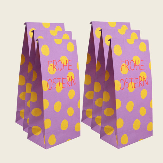 Papiergeschenktüte Punkte gelb/flieder – Frohe Oster, Ava & Yves