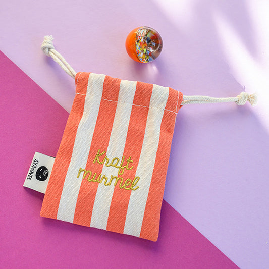 Kraftmurmel aus Muranoglas (orange mit Konfetti-Steinchen) 25mm, in hochwertigem Stoffbeutel mit Stickerei