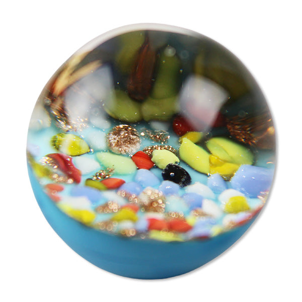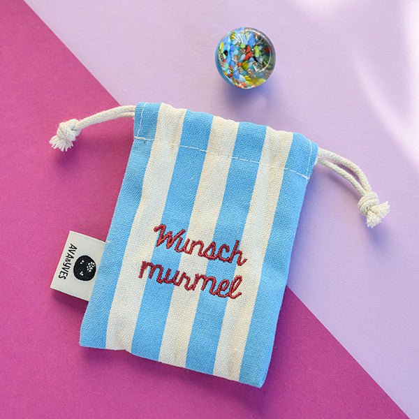 Kraftmurmel aus Muranoglas (blau mit Konfetti-Steinchen) 25mm, in hochwertigem Stoffbeutel mit Stickerei