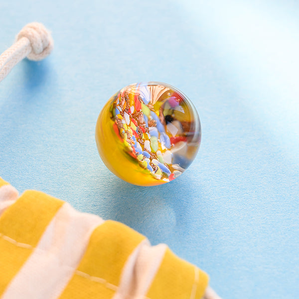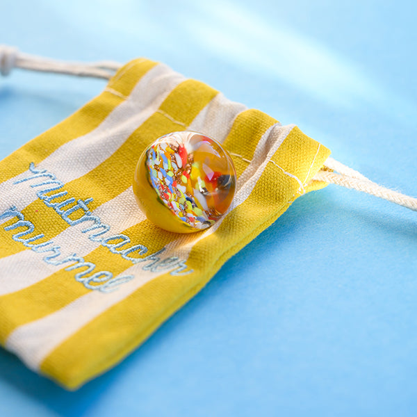 Kraftmurmel aus Muranoglas (gelb mit Konfetti-Steinchen) 25mm, in hochwertigem Stoffbeutel mit Stickerei