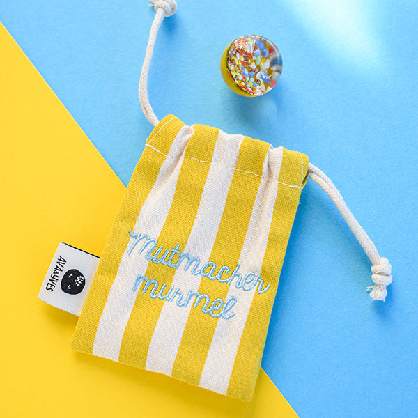 Kraftmurmel aus Muranoglas (gelb mit Konfetti-Steinchen) 25mm, in hochwertigem Stoffbeutel mit Stickerei
