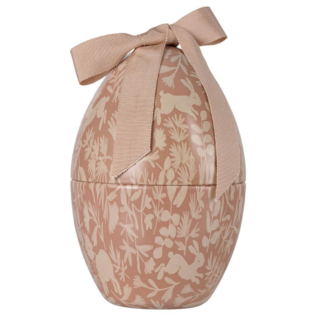 Ein süßer, weicher Plüschhase mit einem Vintage-Baumwollkragen um den Hals, verpackt in einem schönen Metallei mit einem schönen Aufdruck und einer großen weichen Schleife oben drauf - ein perfektes Geschenk für die Kleinen.